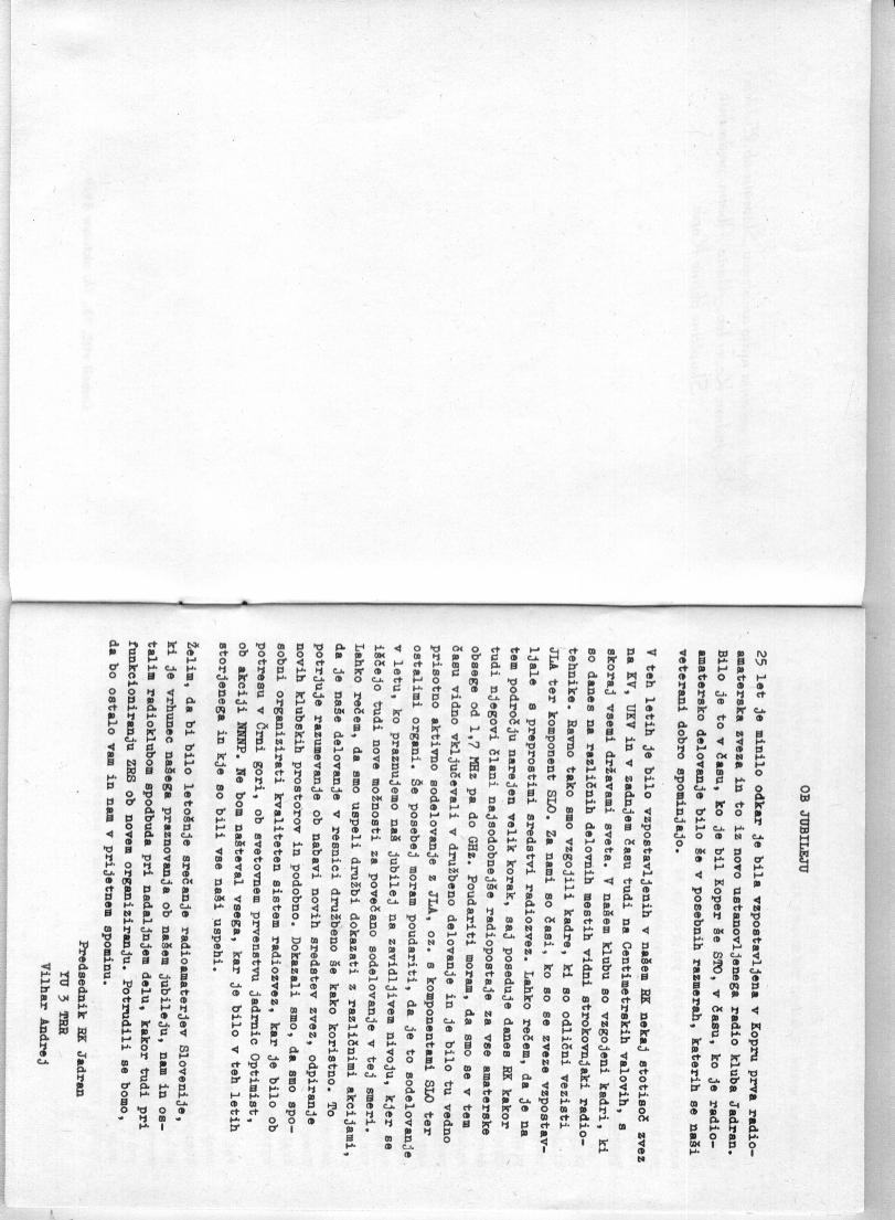 No, Lojze YU3JN, ki je bil pred 25 leti prvi predsednik Radiokluba Jadran Koper, posveca najnovejši jugoslovanski rekord svojemu Radioklubu ob letošnjem jubileju.
